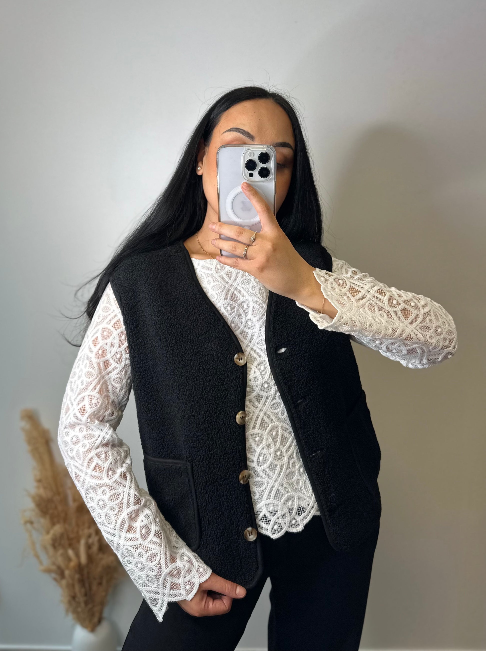 Le gilet noir Teddy JADE est conçu avec une fermeture à pression et une poche pratique, offrant une solution élégante pour accompagner un chemisier. Sa teinte neutre permet une intégration facile dans diverses tenues, rendant cet article polyvalent pour différentes occasions.