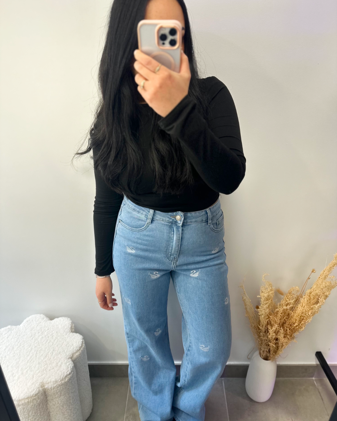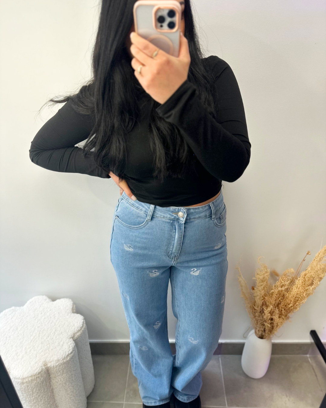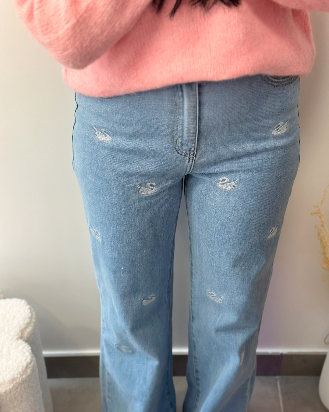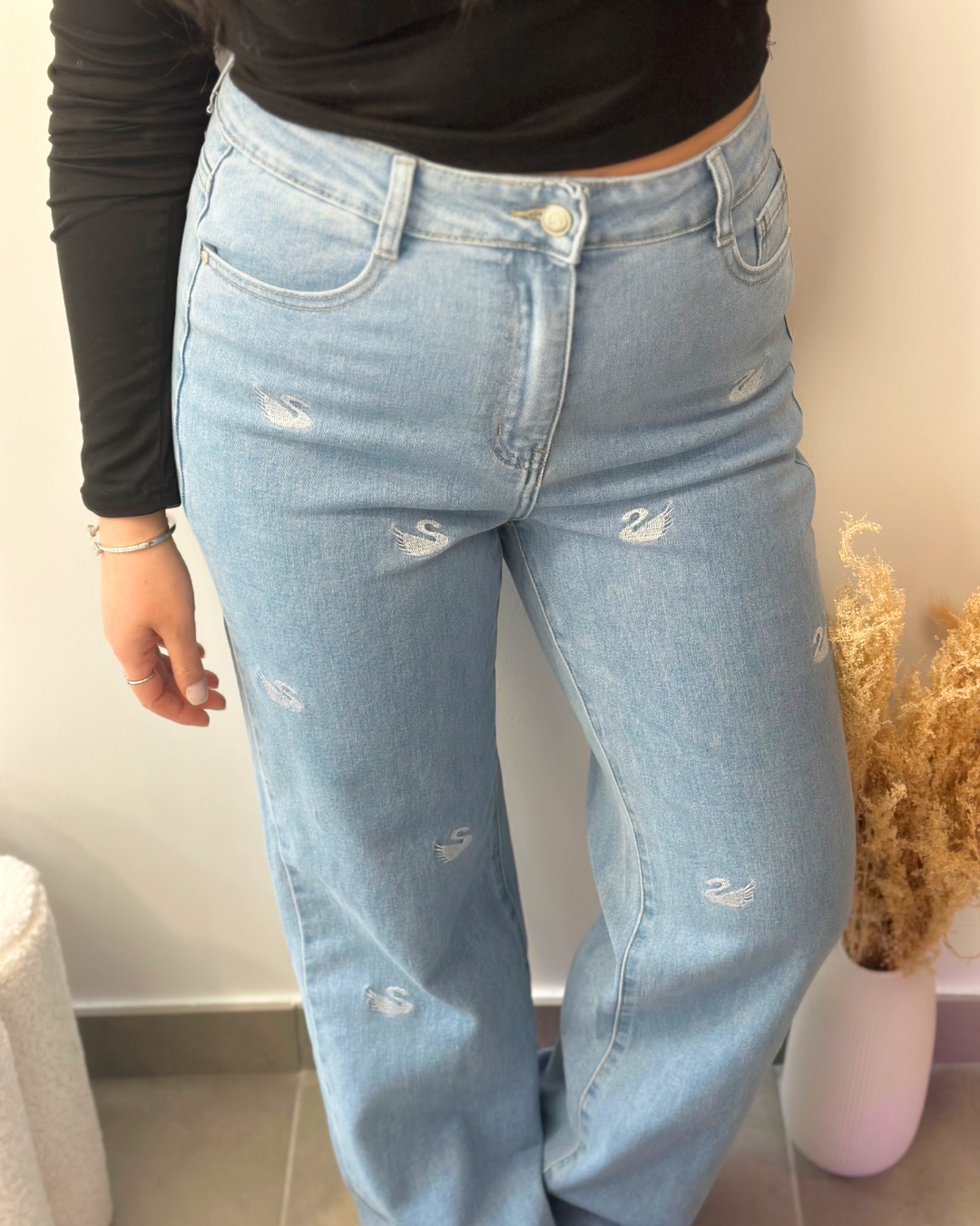 Discover our light-colored jeans with its original swan patterns, a must-have for your wardrobe! Made with a premium fabric, these jeans combine comfort and style for a trendy look.