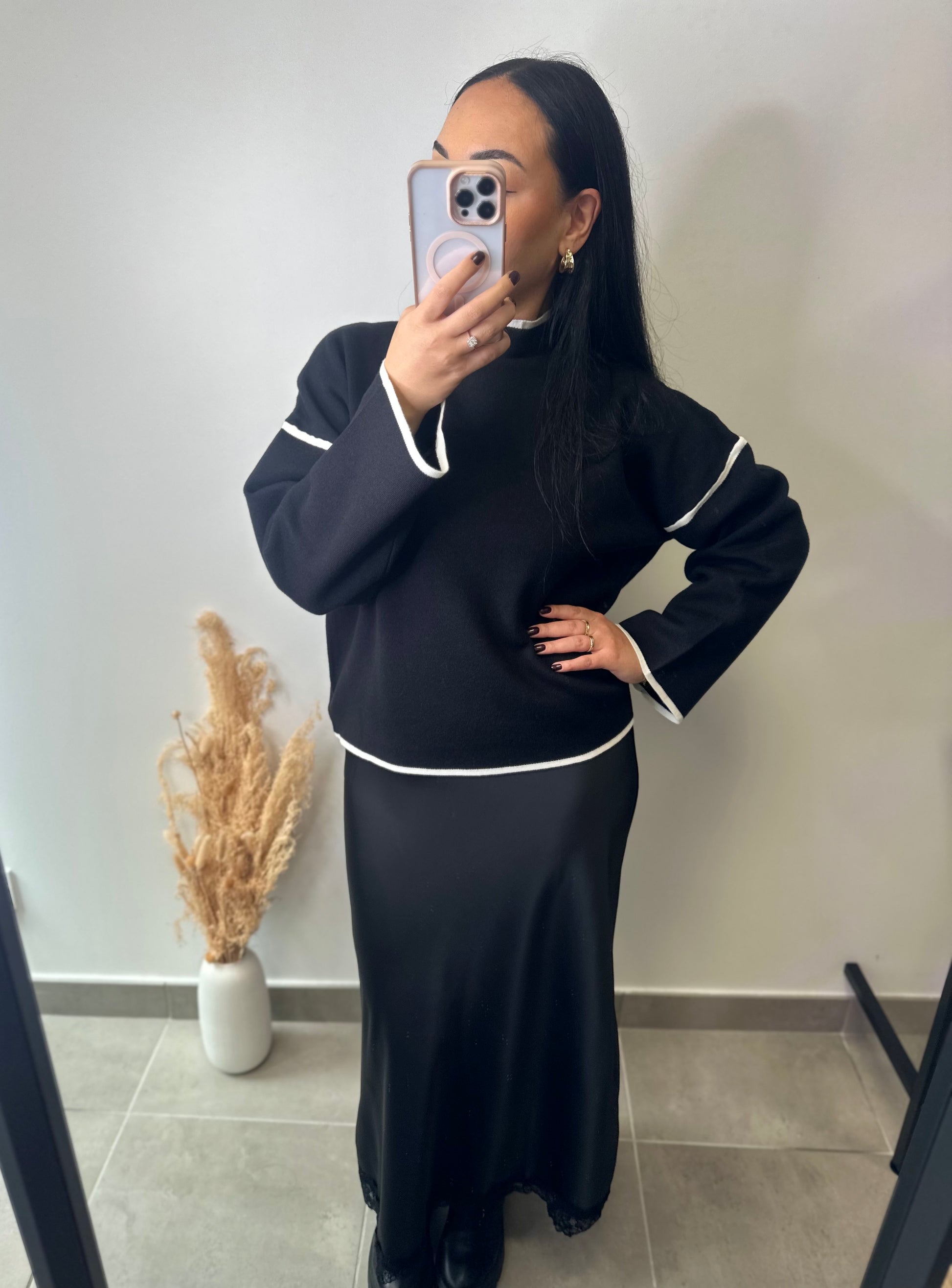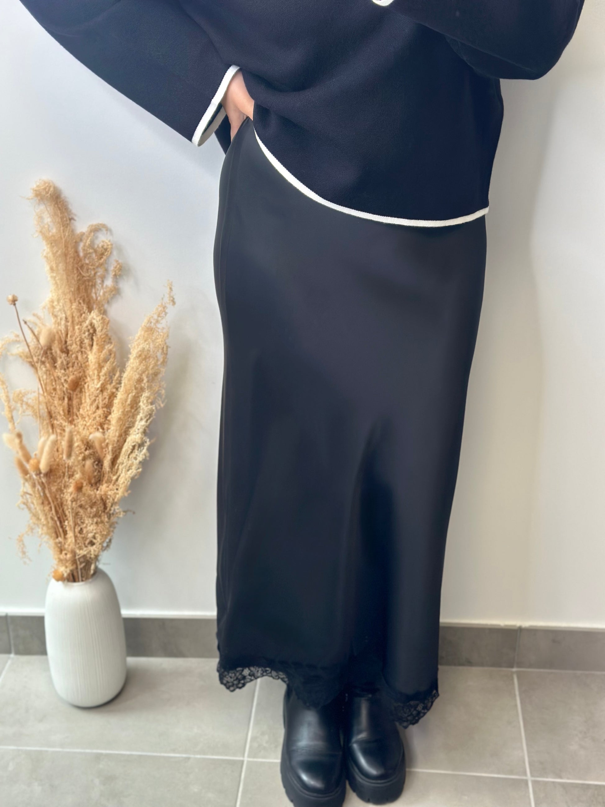 Découvrez notre jupe satinée à dentelle LÉONIE. Cette jupe noire élégante est ornée d'une magnifique dentelle sur le bas. Le tissu satiné et l'élastique vous garantissent un confort optimal tout en vous donnant une allure sophistiquée. Ajoutez cette pièce intemporelle à votre garde-robe et rayonnez en toutes occasions.