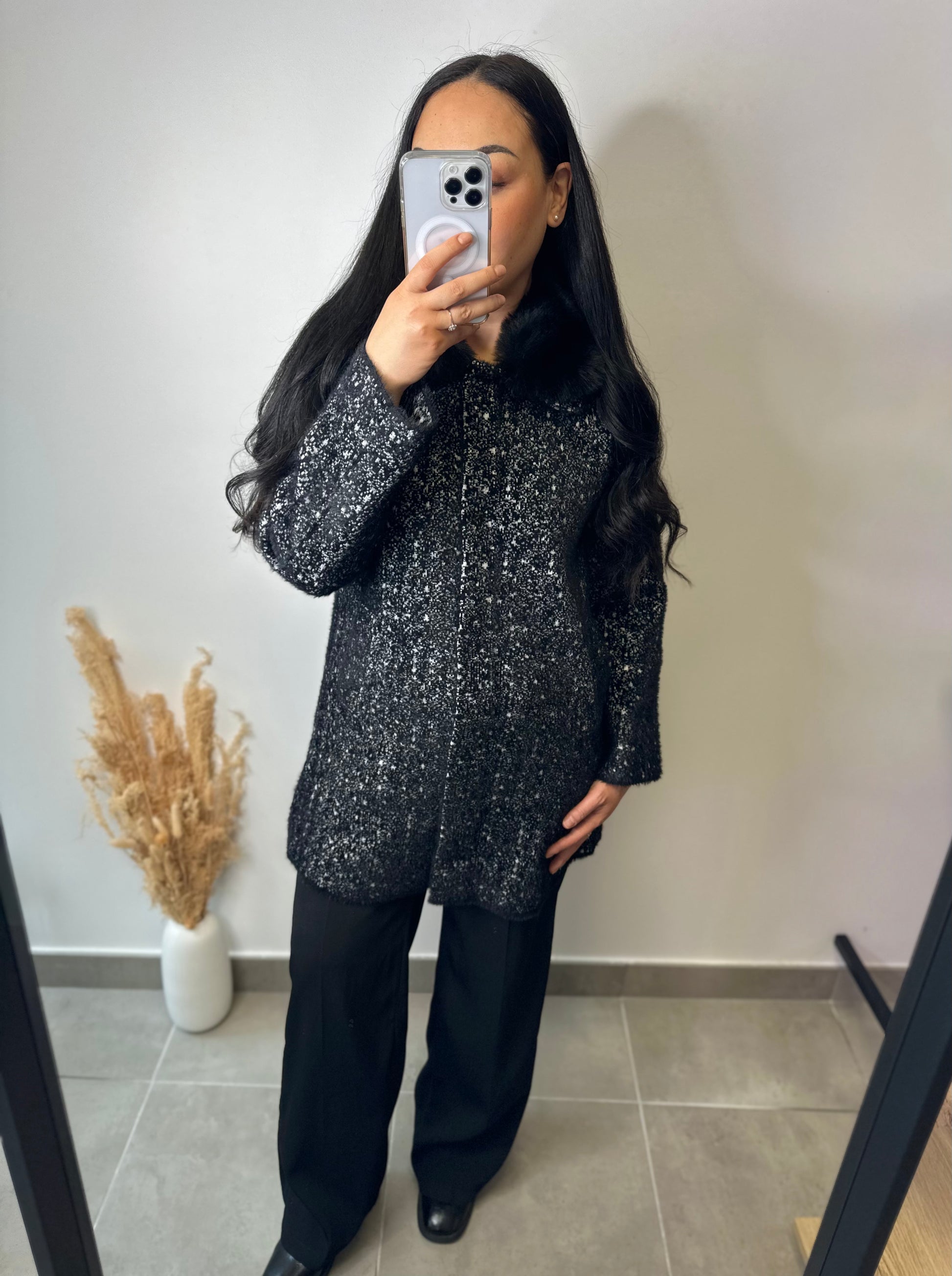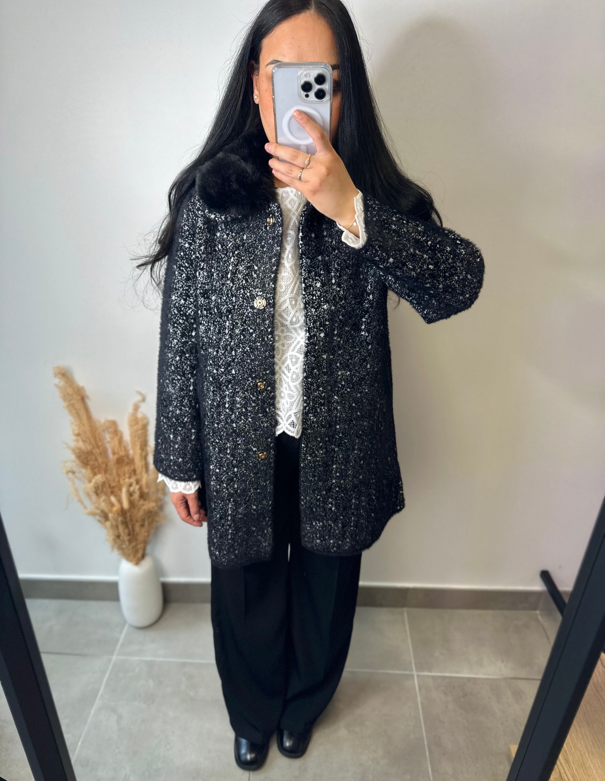 Le manteau chiné COLINE, disponible en beige ou noir, est conçu sans laine pour un confort optimal. Sa collerette en fourrure, amovible, offre une flexibilité esthétique, permettant d'adapter le style selon les occasions. Sa texture chinée ajoute une touche d'élégance tout en restant fonctionnel.