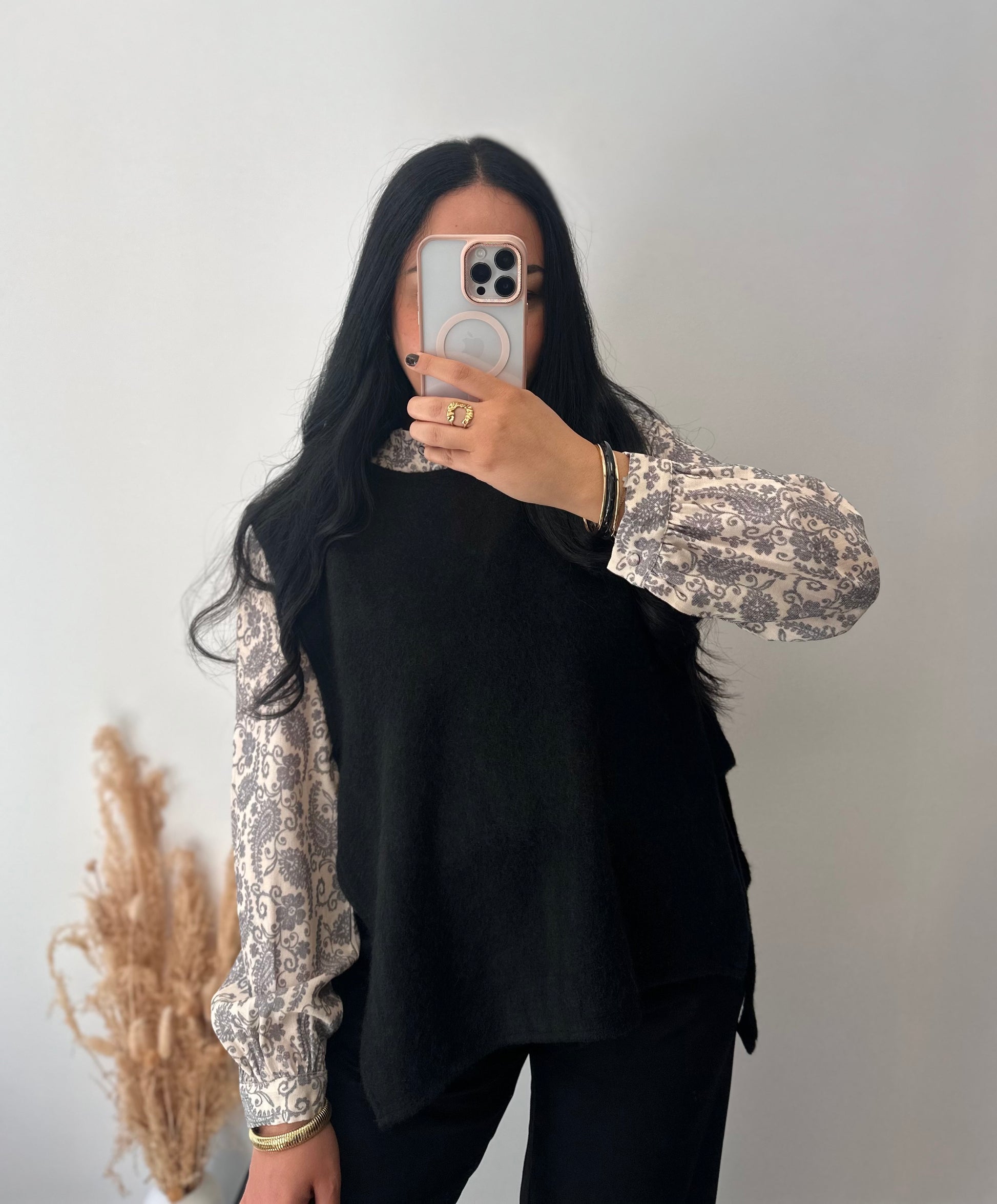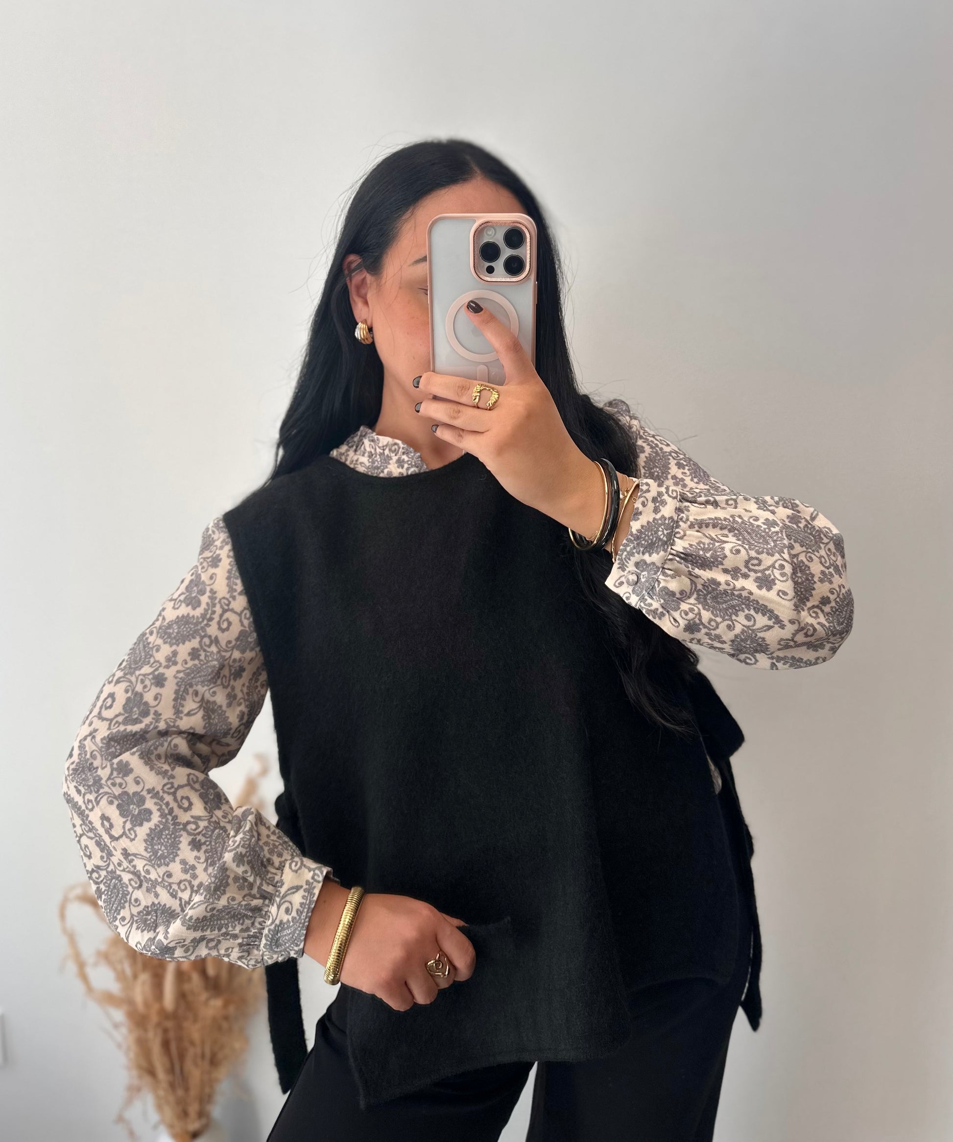 This black sleeveless crew-neck sweater is a wardrobe staple. Its side knots add a touch of elegance and make it perfect for layering over a patterned shirt.