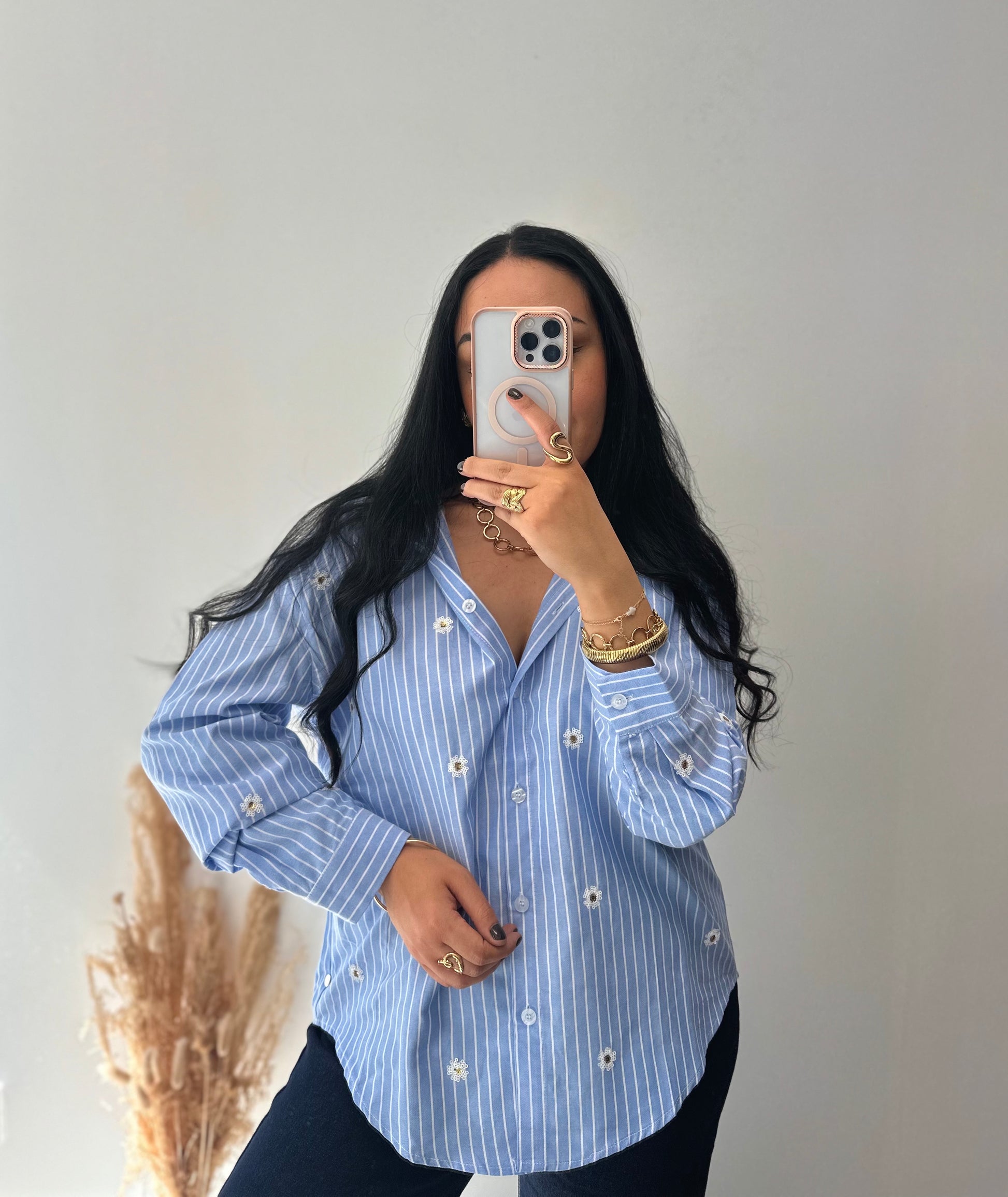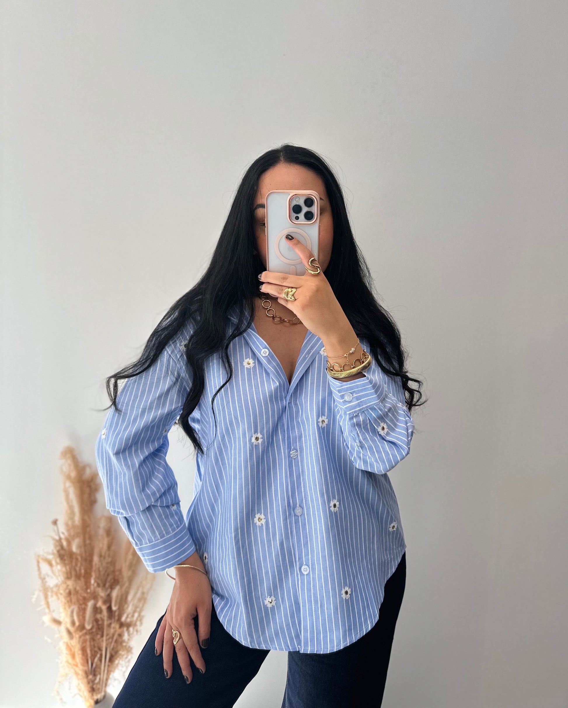 Cette chemise en coton avec des rayures blanches et bleues est un choix chic et élégant. Pour une touche de fantaisie, des petites fleurs cousues en sequins créent un look original et unique.