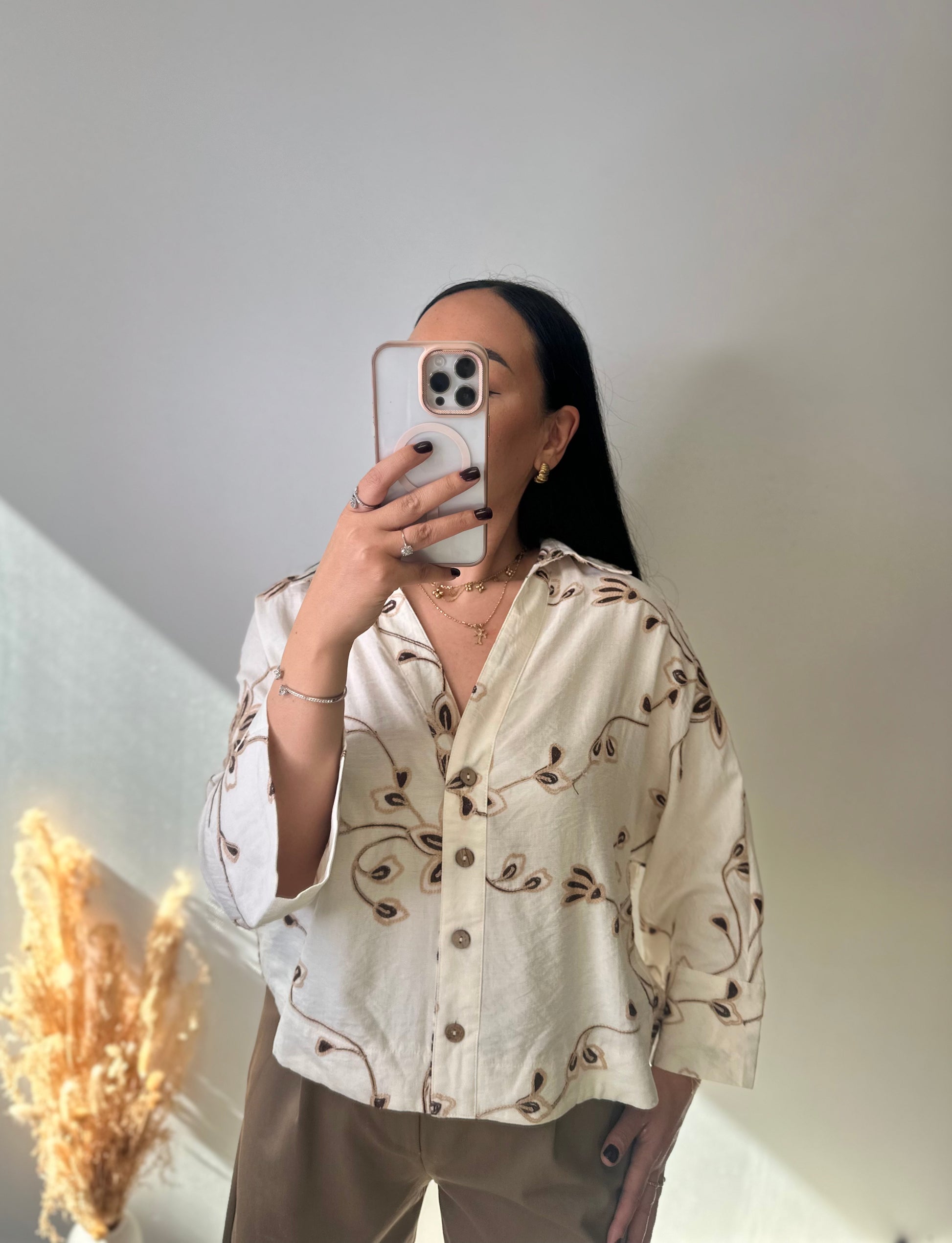 Offrez-vous une touche de douceur avec la chemise écru à motifs fleurs MARGOT. Avec son élégant chemisier en crème garni de fleurs marron et beige, vous apporterez un look féminin et raffiné à votre tenue. Une addition parfaite à votre garde-robe pour toutes les occasions.