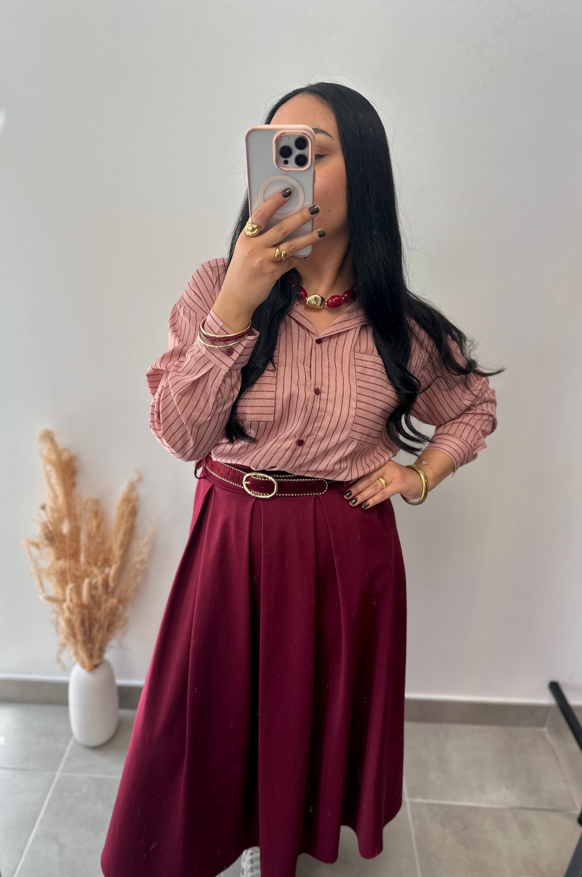 La chemise ALICE en coton vieux rose avec des rayures bordeaux pailletées est à la fois chic et confortable. Son tissu fluide et léger vous permettra de vous sentir à l'aise tout en arborant une allure élégante.