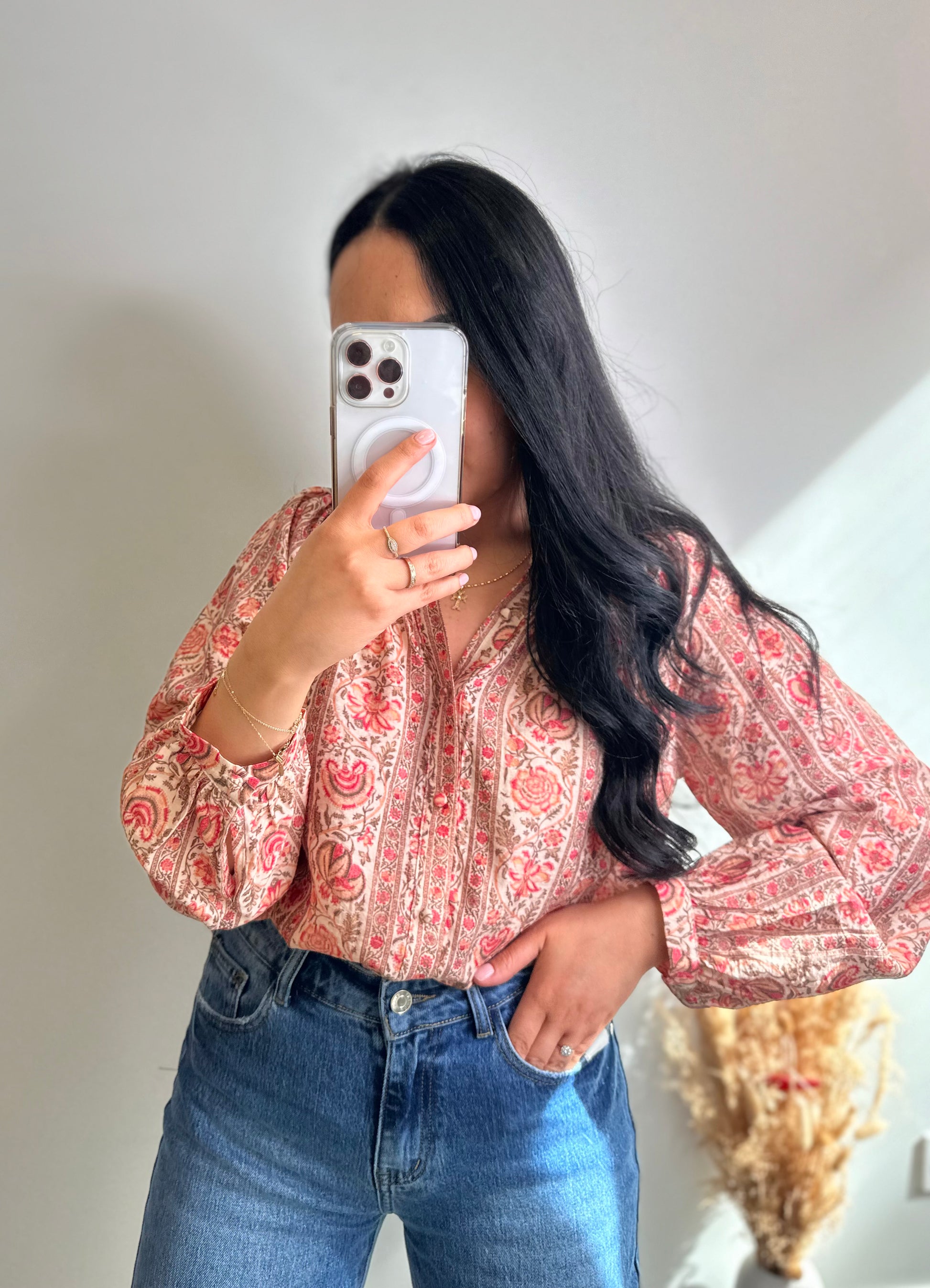 Col mao, chemise souple à motifs fleuries. Lumineuse et fluide