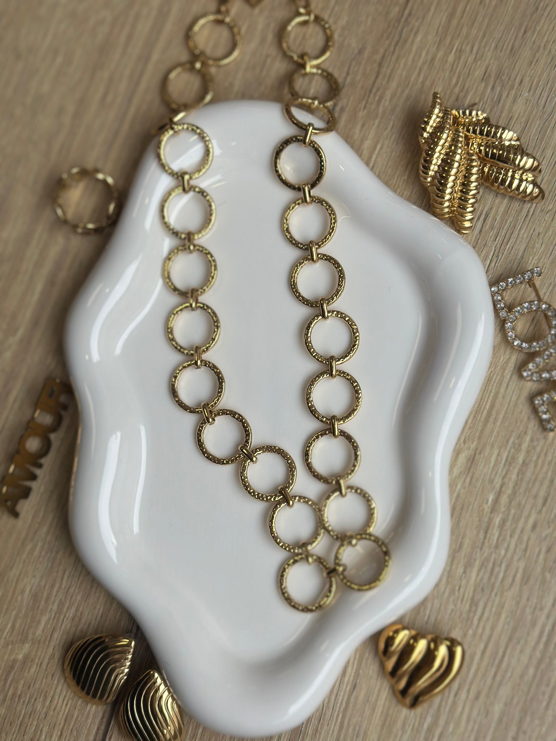 Le collier CHLOÉ est parfait pour ajouter une touche de sophistication à votre look. Fabriqué avec un design fluide et des ronds dorés, il apportera une élégance subtile à n'importe quelle tenue.