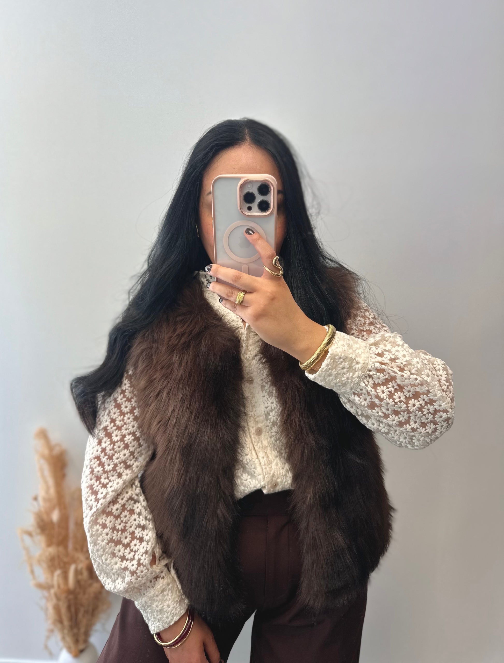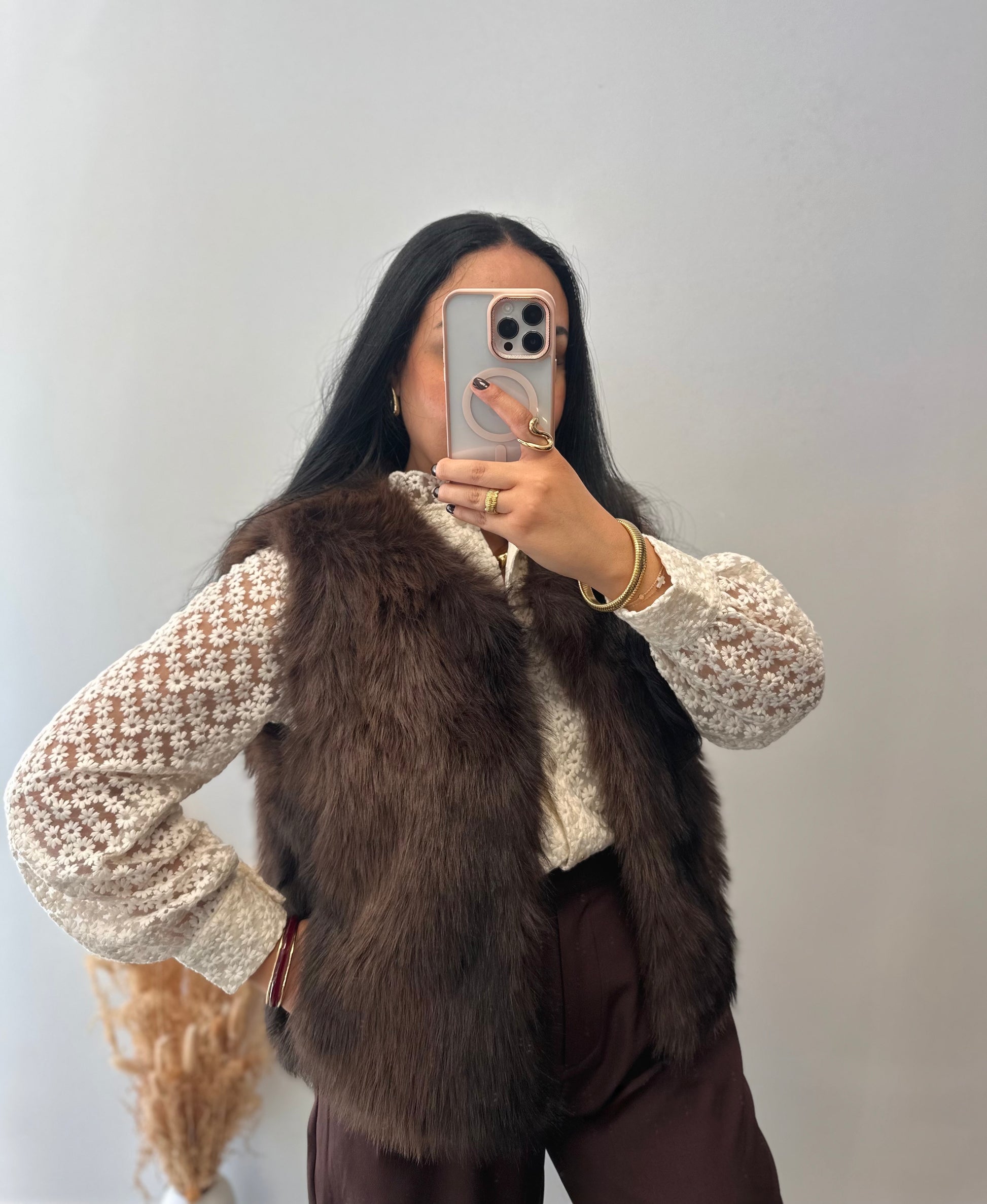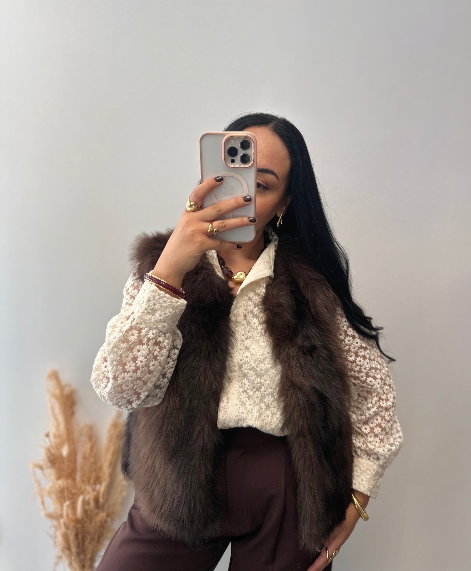 La fourrure sans manches à poches marron LUNA est l'accessoire parfait pour vos tenues élégantes et chaleureuses. Fabriquée en fausse fourrure de qualité supérieure, elle est dotée de poches pratiques et d'un système d'accroche pour se fermer entièrement.