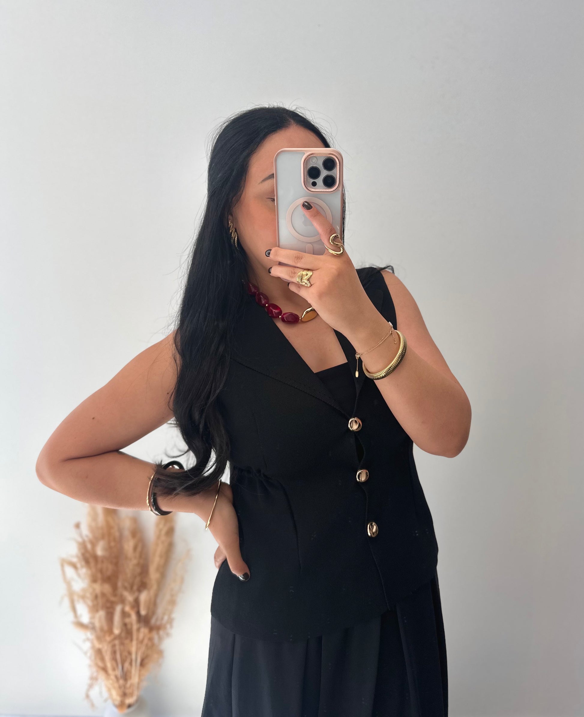 Ce gilet noir ajusté à la taille mettra en valeur votre silhouette grâce à ses boutons dorés. Un choix élégant et sophistiqué pour toutes les occasions. Conçu avec des matériaux de qualité pour un confort inégalé.