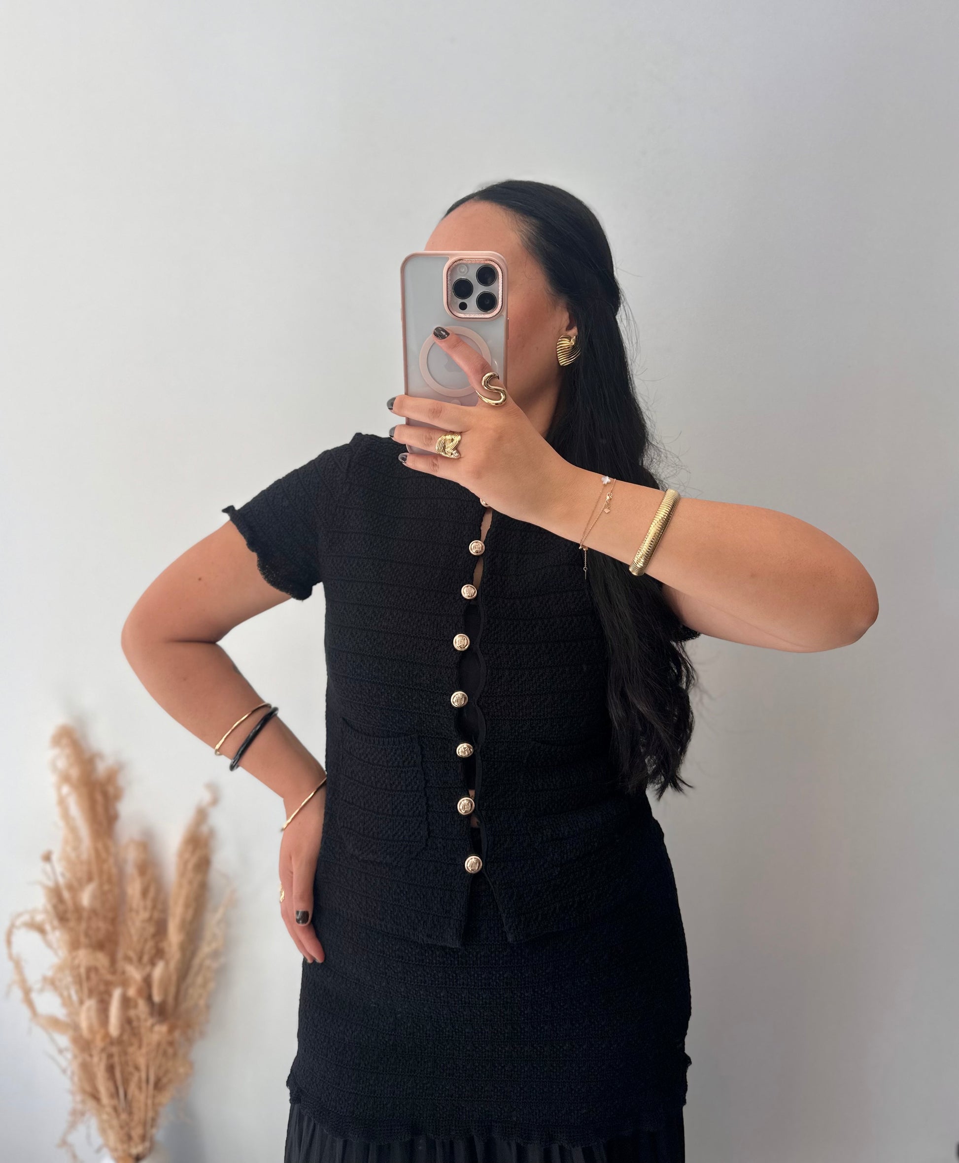 Ce gilet noir mettra en valeur votre silhouette grâce à ses boutons dorés. Un choix élégant et sophistiqué pour toutes les occasions. Conçu avec des matériaux de qualité pour un confort inégalé.