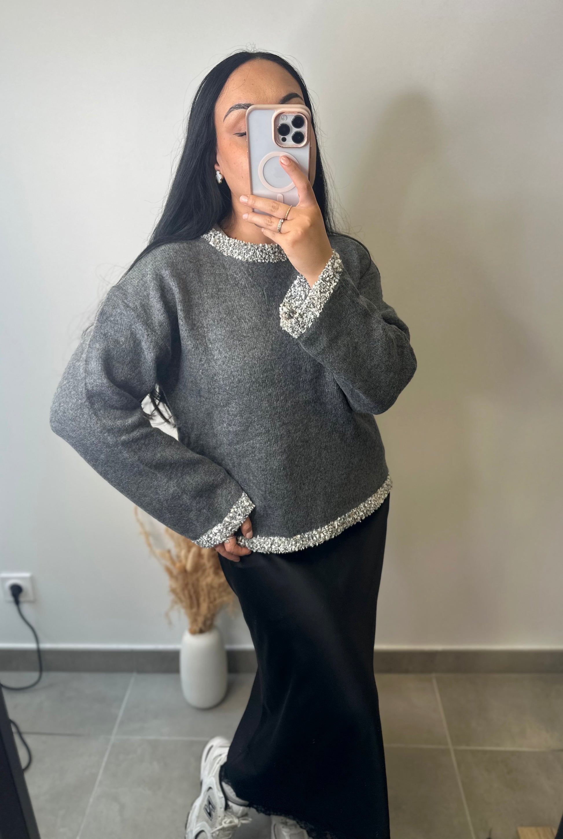 Offrez-vous un look élégant avec notre Pull gris à détails - LOU. Fabriqué avec un tissu doux, il est confortable à porter et ses détails aux manches et au cou vous donneront une allure tendance. Ajoutez cet article à votre garde-robe pour un style chic et confortable.