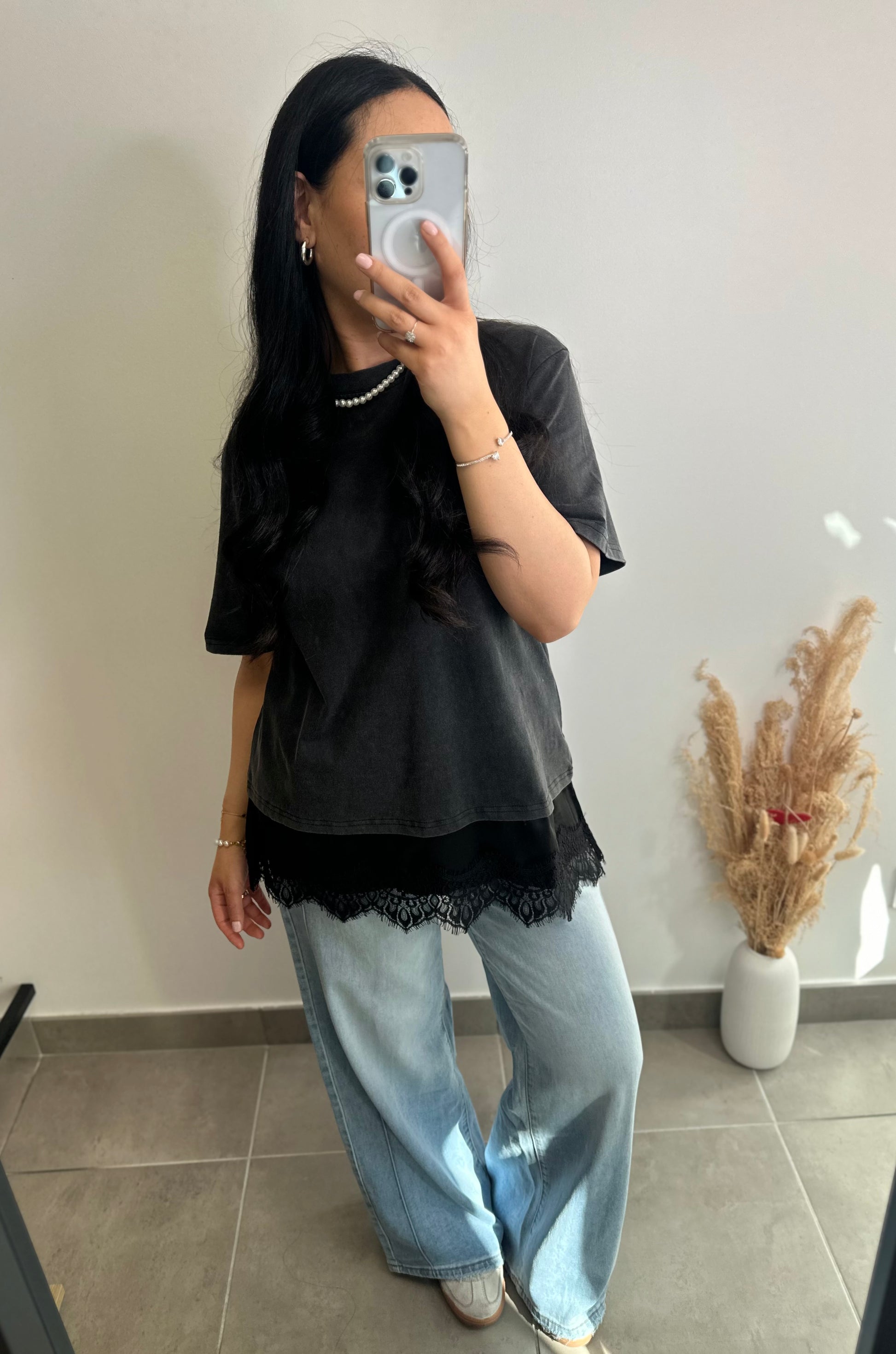T shirt oversize à dentelles et matière satinée